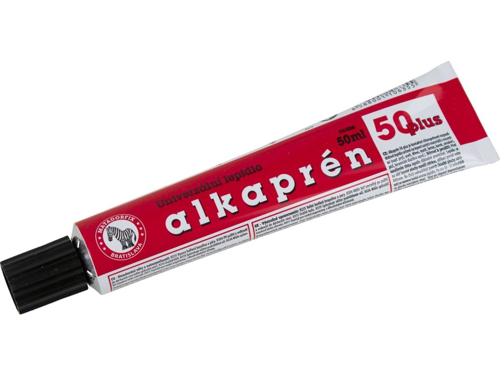 Kaučukové lepidlo na lepení savých materiálů s nesavými. Lepidlo Alkaprén 50 Plus se při lepení savých materiálů s nesavými (např. guma - beton, kůžen - guma, umakart - dřevo) nanáší jen jednou a to buď stěrkou, stříkací pistolí nebo štětcem. Při lepení savých materiálů se musí před slepením aspoň jeden z lepených materiálů natřít ještě jednou. Před nanášením je potřeba lepidlo dokonale promíchat. Na každý čistý odmaštěný povrch (hladké plochy se doporučují zdrsnit) se nanese tenká vrstva lepidla, nechá sa zavadnout a potom se oba povrchy slepí. Slepený spoj se doporučuje zatížit nebo zalisovat. Mechanicky je možné lepený spoj namáhat až po 24 hodinách od slepení. Optimální podmínky na lepení jsou při teplotě 20 °C. Podchlazené lepidlo vytváří spoj s podstatně nižší pevností. Při teplotě nižší než 5 °C může nastat zgelování. V tomto stavu je lepidlo nepoužitelné. Původní konzistence se získá pozvolným vytemperovaním v místnosti při teplotě cca 25 °C. Během temperování je potřeba lepidlo několikrát promíchat. Po vytemperovaní má lepidlo původní fyzikálně-mechanické vlastnosti. Netemperuje se přímým ohřevem! Při teplotách pod 0 °C lepidlo nevratně koaguluje a není možné oživit jeho lepící schopnosti.Doplňkové parametry