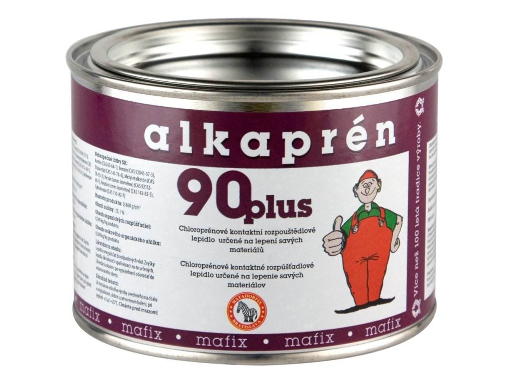 Kaučukové lepidlo na lepení materiálů se savým povrchem. Lepidlo Alkaprén 90 Plus se na každý materiál (např. textil, překližka, dřevo, beton) nanáší jen jednou a to buď stěrkou, stříkací pistolí nebo štětcem. Před nanášením je potřeba lepidlo dokonale promíchat. Na každý čistý odmaštěný materiál (hladké plochy se doporučují zdrsnit) se nanese tenká vrstva lepidla, nechá se zavadnout a potom se oba povrchy slepí. Slepený spoj se doporučuje zatížit nebo zalisovat. Mechanicky je možné lepený spoj namáhat až 24 hodin po slepení. Optimální podmínky na lepení jsou při teplotě 20 °C. Při teplotě nižší než 5 °C může nastat zgelování. V tomto stavu je lepidlo nepoužitelné. Původní konzistence se získá pozvolným temperováním v místnosti při teplotě cca 25 °C. Během temperování je potřeba lepidlo několikrát promíchat. Po vytemperování má lepidlo původní fyzikálně - mechanické vlastnosti. Netemperovat přímým ohřevem! Při teplotách pod 0 °C lepidlo nevratně koaguluje a není možné oživit jeho lepící schopnosti.Doplňkové parametry