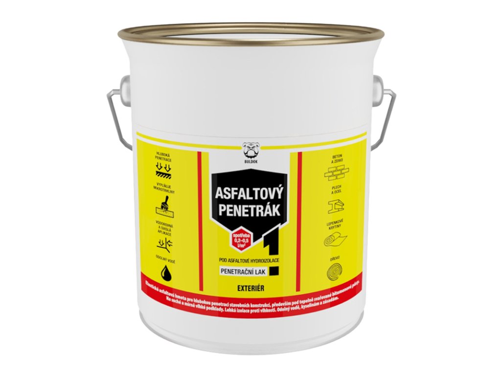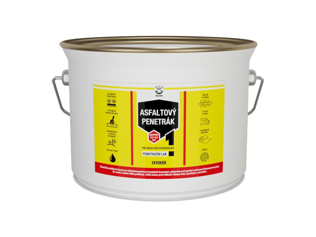 Jednosložkový elastický asfaltový penetrující nátěr. Speciálně vyvinutý pro penetrace stavebních konstrukcí např. pod asfaltové hydroizolační pásy (lepenky). Tento přípravek je určený pro penetrační nátěry stavebních materiálů pod živičné izolační krytiny a nátěry. Vhodný k penetraci podkladů pro zvýšení přilnavosti následných vrstev, penetraci základních betonových desek podlah, teras a balkonů, penetraci betonových střech před aplikací hydroizolačních asfaltových pásů, penetraci septiků a vodních jímek před následnou živičnou asfaltovou izolační vrstvou.ASFALTOVÝ PENETRÁK je jednosložkový přípravek na bázi asfaltové disperze modifikované syntetickým kaučukem, speciálně vyvinutý pro penetrace stavebních konstrukcí.
