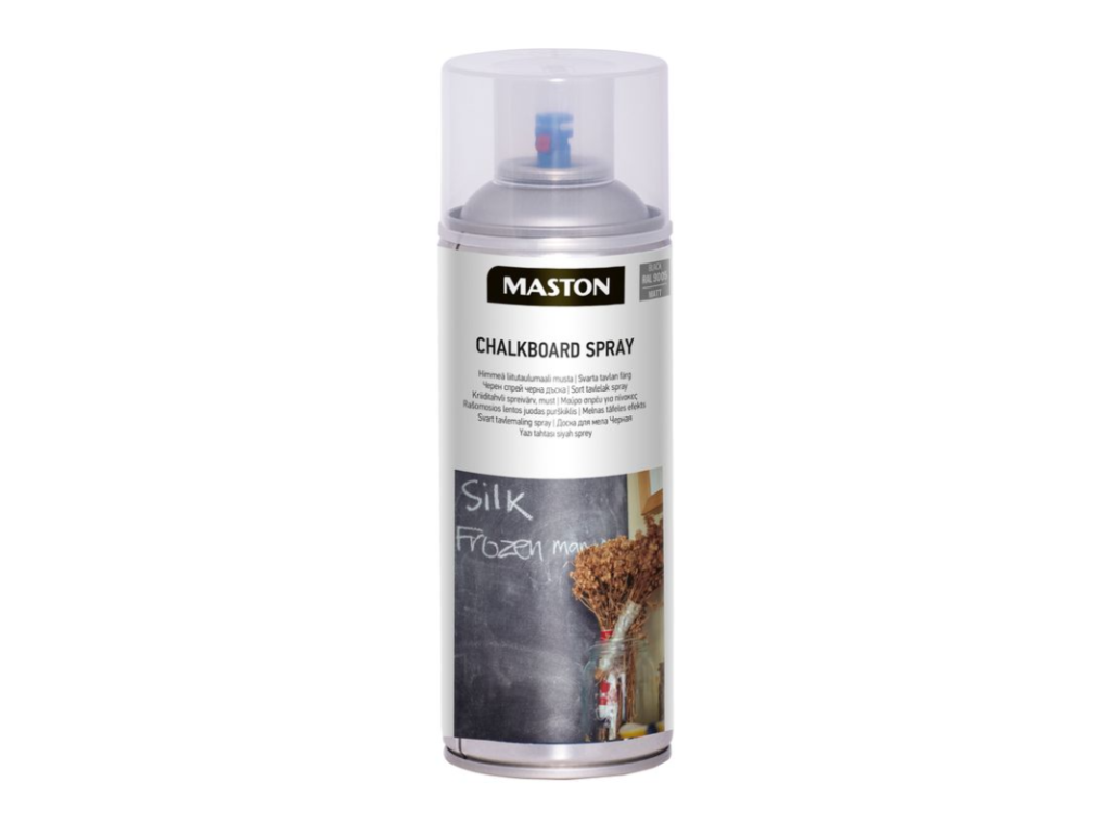 Super matná barva k vytvoření vaší vlastní tabule doma.MASTON CHALKBOARD SPRAY je super matná barva k vytvoření vaší vlastní tabule doma. Chalkboard. Spray lze použít na dřevěný nebo kovový povrch nebo hladké omítky. Když je barva suchá, na tabuli můžete psát křídou a smazat to vodou. Tryska (červený bod) může být nastavena v horizontální nebo vertikální stříkací pozici. Zkuste vhodnost na plastových površích postřikem malé zkoušky na neviditelném místě. Některé plasty, například polykarbonáty nebo akryláty mohou reagovat s rozpouštědly produktu. Natřete nejméně dvě vrstvy a nechte zaschnout mezi vrstvami až do matu.