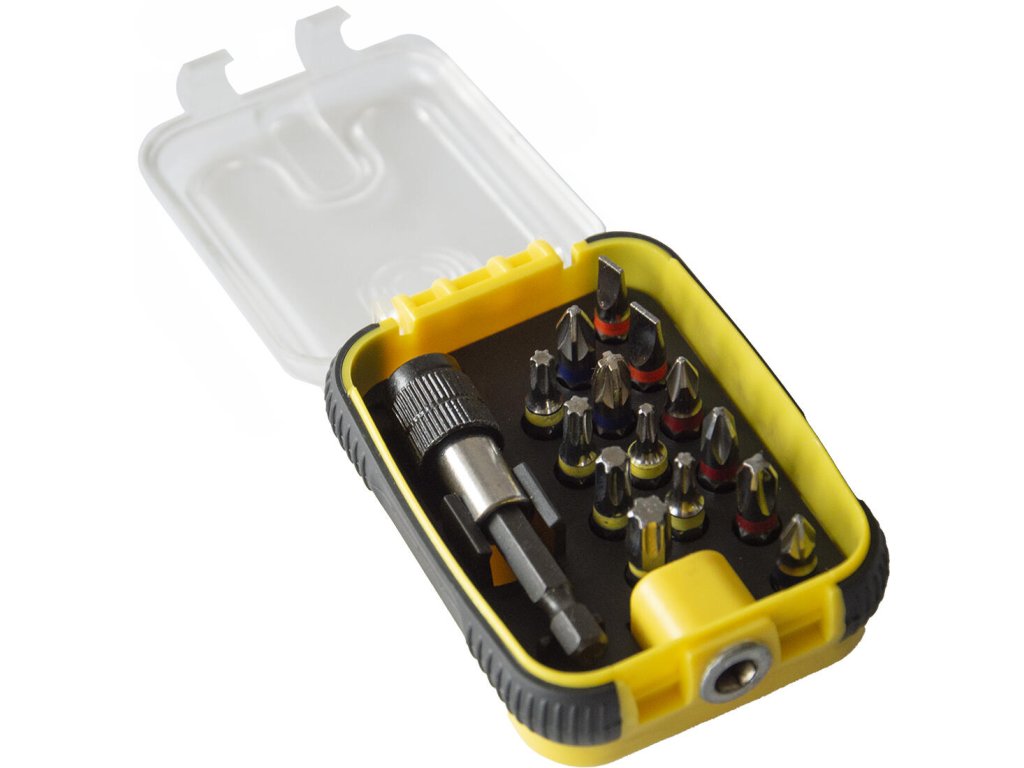 Bit nástavec sada 15díl. S2 M.A.T. materiál: držák CRV + S2 bity + PP krabička povrchová úprava: černění hmotnost: 0,17 kg počet dílů: 15 sada obsahuje: * 1 ks držák bitů: 14-25 mm * 14 ks bitů s barevným kroužkem - ploché: 5-6 - PH: 1-2-3 - PZ: 1-2-3 - Torx: T10-T15-T20-T25-T30-T40Doplňkové parametry