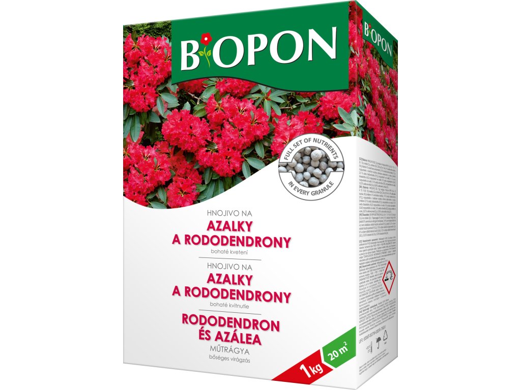 Vícesložkové minerální hnojivo určené k regulaci kyselosti půdy podle potřeb rododendronů a azalek. Vysoký obsah draslíku pozitivně ovlivní vzhled rostliny. Přítomnost fosforu prodlužuje dobu květu a stimuluje vývoj poupat. Rostliny hnojené hnojivem Bopon na rododendrony a azalky jsou obsypané květy během celého vegetačního období.