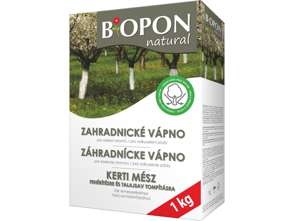 Univerzální zahradnické vápno pro ošetřování stromů a snižování kyselosti půdy, jejíž pH je příliš nízké. Vápnění stromů a keřů v zimním až jarním období chrání před zmrznutím a vytvářením hlubokých trhlin, díky kterým jsou rostliny náchylnější k infekcím a napadení škůdci. Vápnem ošetřené kmeny stromů účinně odráží sluneční světlo a chrání kmen před přehříváním. Díky tomu, se neobjeví v kůže svislé trhliny. Odkyselení půdy s pomocí vápna umožňuje udržovat optimální pH v půdě a současně zlepšuje konzistenci půdy a zvyšuje účinnost ostatních hnojiv. Tento postup je potřeba opakovat, protože pH půdy se pravidelně a přirozeně snižuje.