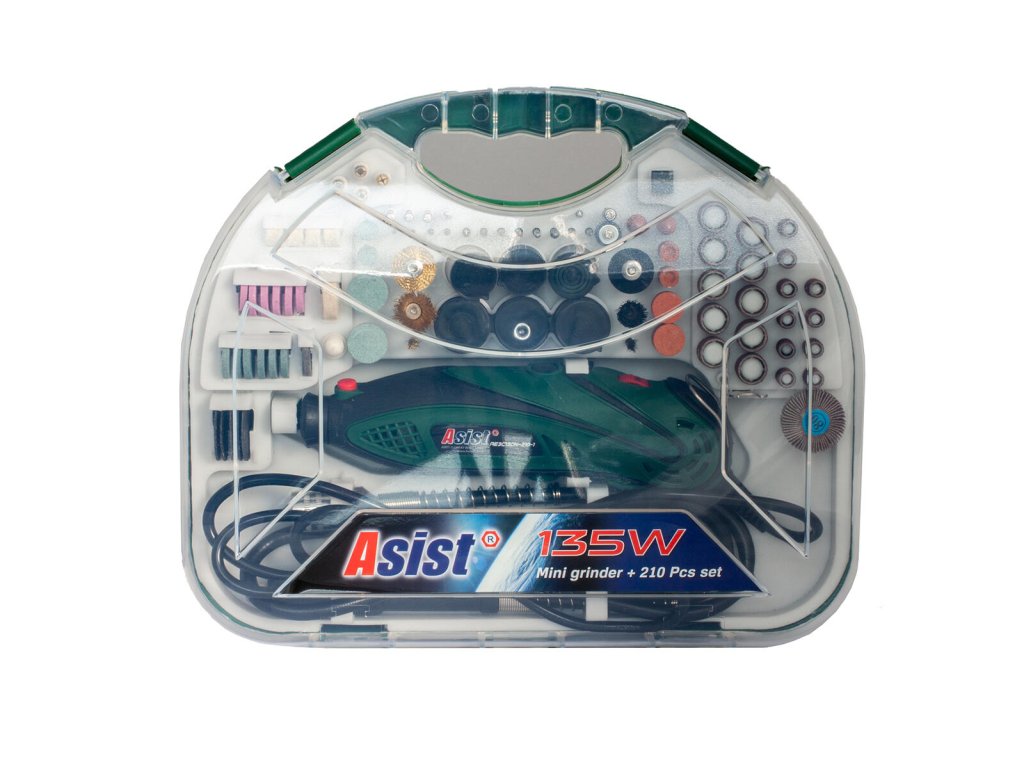 bruska mini přímá 135W v kufru, příslušenstvím 210díl. ASIST
