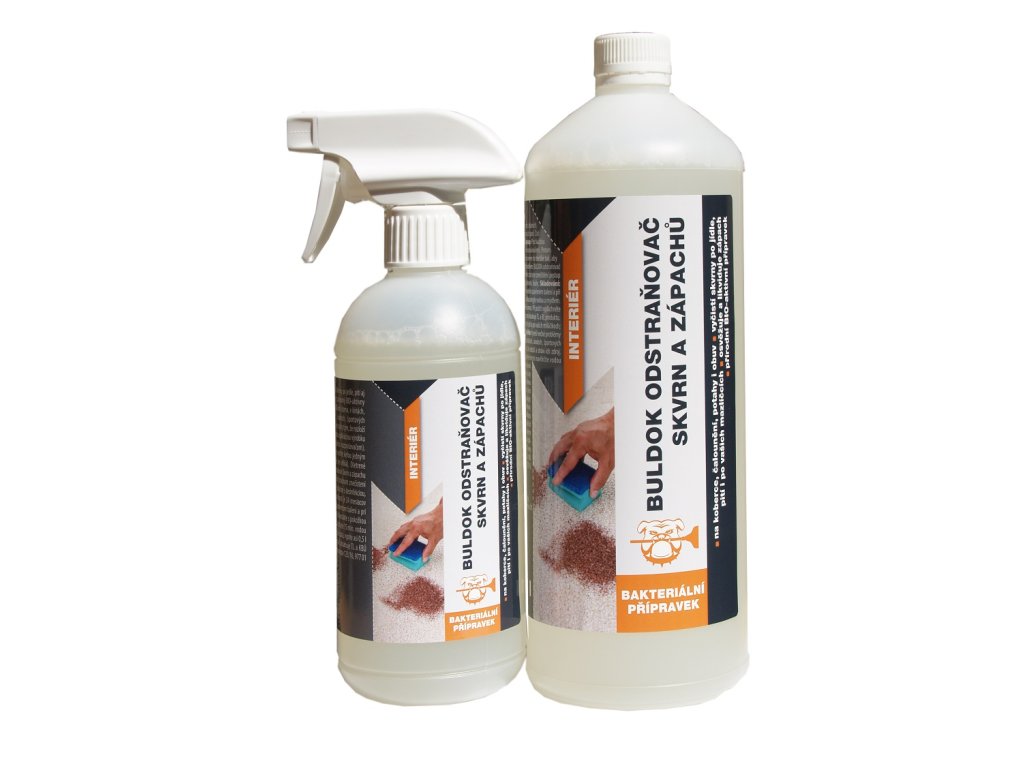 BULDOK Odstraňovač skvrn a zápachu je přírodní bio-aktivní přípravek pro likvidaci skvrn a zápachu z koberců, čalounění, potahů, obuvi nebo WC.