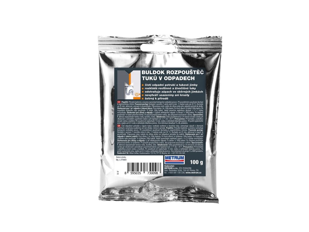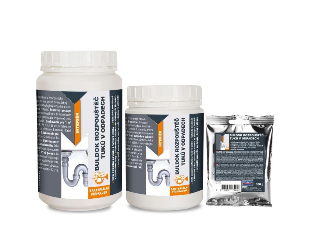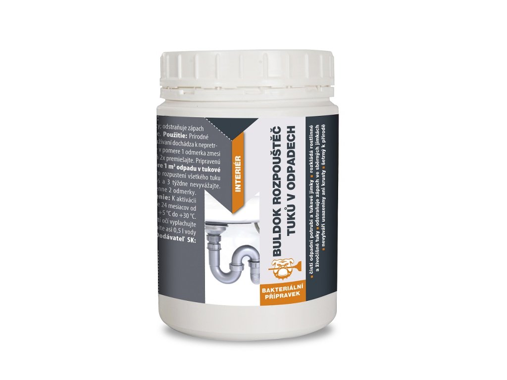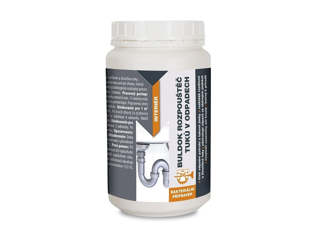 Přírodní bakteriální přípravek k rozložení veškerých tukových usazenin v odpadním potrubí. Přípravek na bázi směsi přírodních bakterií a enzymů, jenž spolehlivě odstraňuje tukové nánosy a zápach ve sběrných jímkách. Vlivem pravidelného používání se zabraňuje zpomalování odtoku a usazování rostlinných a živočišných produktů v odpadním systému. Zabezpečuje jeho stálou funkčnost. Přípravek neškodí lidskému zdraví a je šetrný vůči životnímu prostředí.BULDOK Pro rozpad tuků v odpadech je přírodní bakteriální výrobek pro rozložení tuků v odpadním potrubí a tukových lapolech.