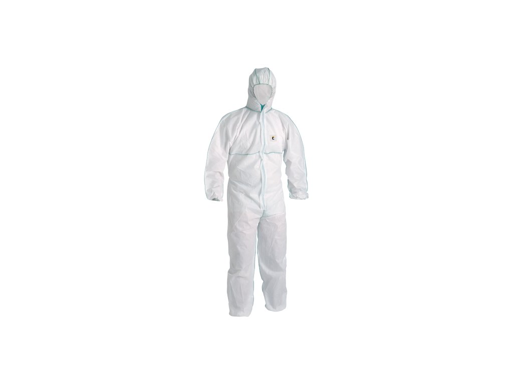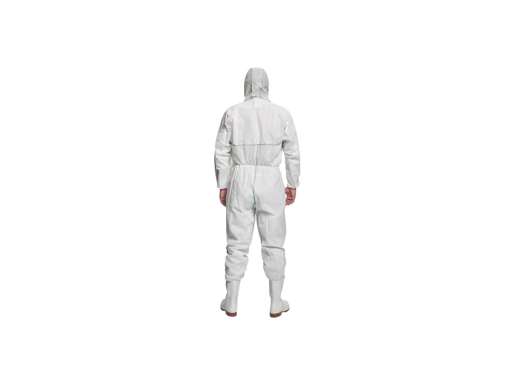 • ochranná jednorázová kombinéza s kapucí a klopou na zipu a gumičkou stahovatelnými rukávy a nohavicemi • je odolná některým chemikáliím a průniku radioaktivních částic • zároveň chrání proti statické elektřině • v ochraně proti postřiku kapalnými chemikáliemi patří do kategorie CE III • v ochraně proti průniku pevných částic a ochraně proti aerosolům typu 5 • v ochraně proti postřiku kapalnými chemikáliemi typu 6 • v ochraně proti kontaminaci radioaktivními částicemi do kategorie Class 1.Doplňkové parametry