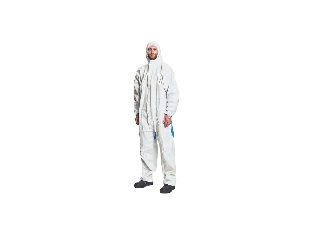 • ochranná antistatická jednorázová kombinéza s kapucí slouží i pro ochranu proti nebezpečným mirkoorganizmům • přední materiál je vyroben s mikroporézní paropropustné vrstvy • zadní panely v modré barvě jsou z prodyšného polypropylenu, materiálu SMMS, zlepšující komfort při práci • na konci manžet jsou umístěny poutka na palce, aby rukávy vždy perfektně seděly na rukou • elastické okraje rukávů i nohavic • v ochraně proti postřiku kapalnými chemikáliemi patří do kategorie CE III • v ochraně proti průniku pevných částic a ochraně proti aerosolům typu 5 • v ochraně proti postřiku kapalnými chemikáliemi typu • v ochraně proti kontaminaci radioaktivními částicemi do kategorie Class 1Doplňkové parametry