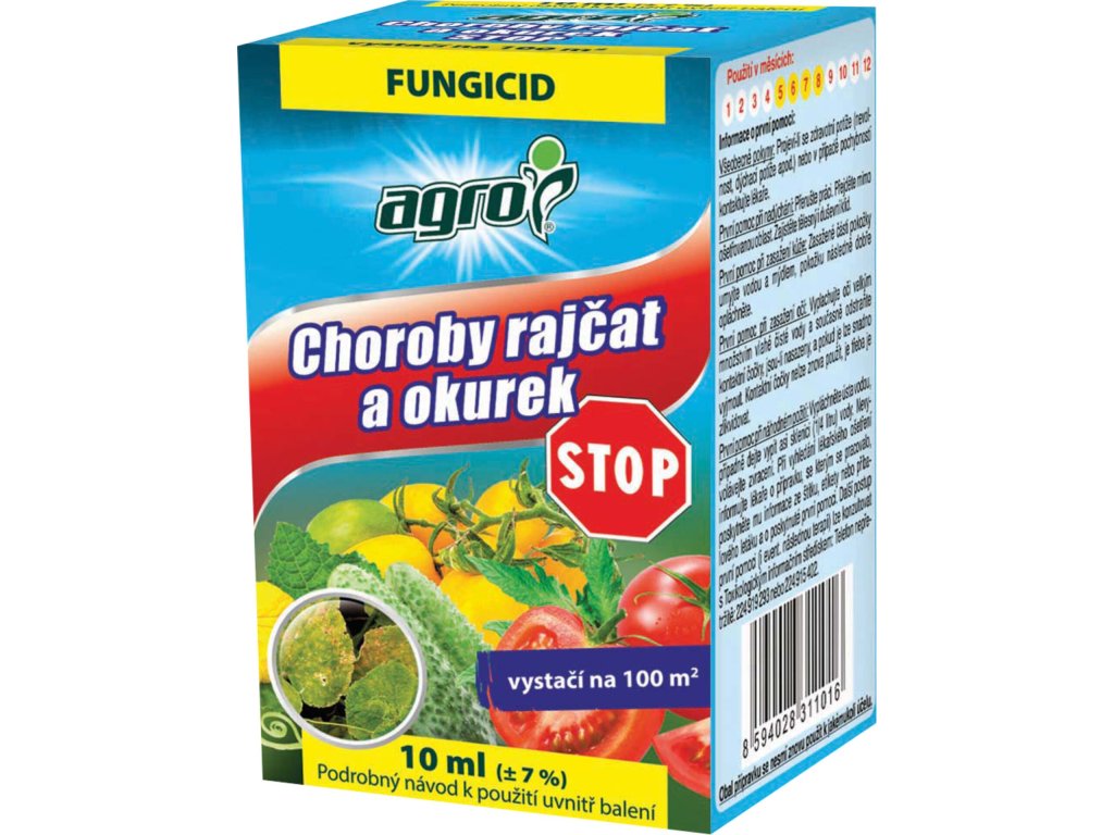 AGRO Choroby rajčat a okurek STOP je postřikový fungicid s protektivním (ochranným) účinkem. Používejte k ochraně proti plísním okurek a rajčat, a také cuket, cibule, hráchu a česneku. Aplikuje postřikem nebo rosením před nebo na počátku infekce (preventivně nebo při zjištění prvních příznaků).