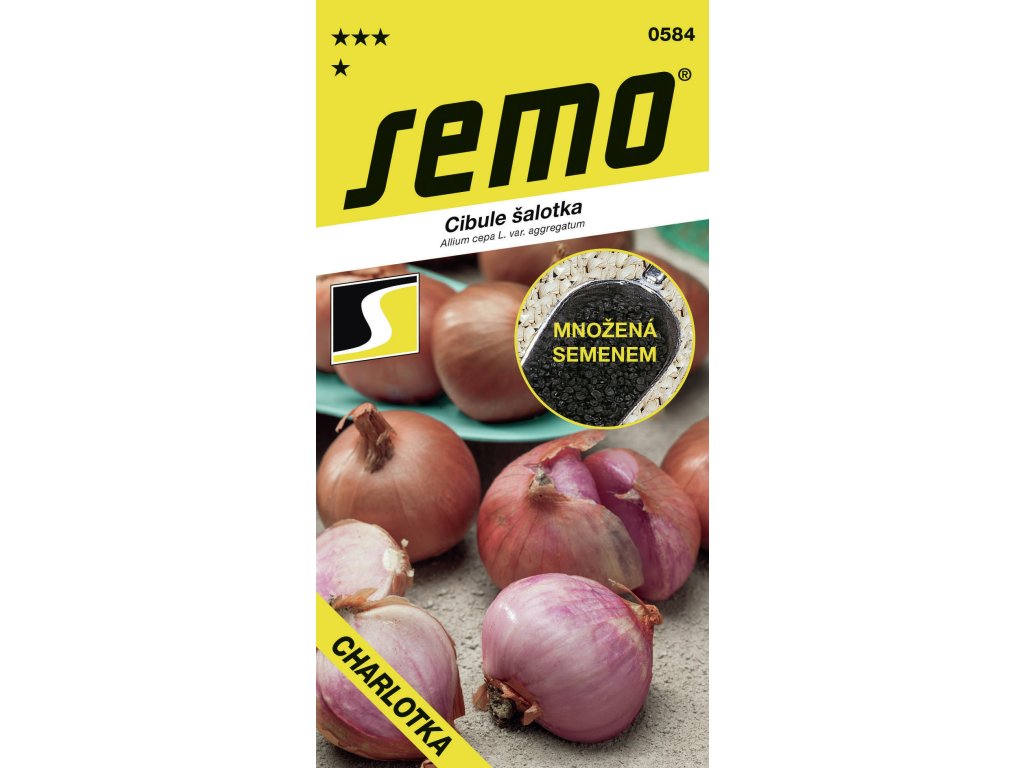 CHARLOTKA (SM–C–901/2020)SM (kód 0584) – naše raná šalotka se pěstuje pouze ze semen. Není to typická „množilka“, při jejím přesazení získáme opět jen jednu cibuli. Její kulovité cibule mají šířku 5–6 cm a průměrnou hmotnost 70 gramů. Mají typickou šalotkovou barvu – tedy načervenalou, můžeme říci i červenoměděnou. Odrůda se vyznačuje jemnou cibulovou chutí charakteristickou pro šalotky a velmi dlouhou skladovatelností.