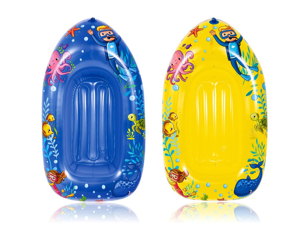 Člun nafukovací 112 x 70 cm, mix barev. rozměry: 112 x 70 cm mix barev: žlutá, modrá Dětský nafukovací člun OCEAN WORLD v barevném provedení s mořskými motivy je skvělý při hrátkách dětí ve vodě. V přední části člunu je umístěn úchyt na provaz. Je určen pro děti ve věku 3 - 6 let.Doplňkové parametry
