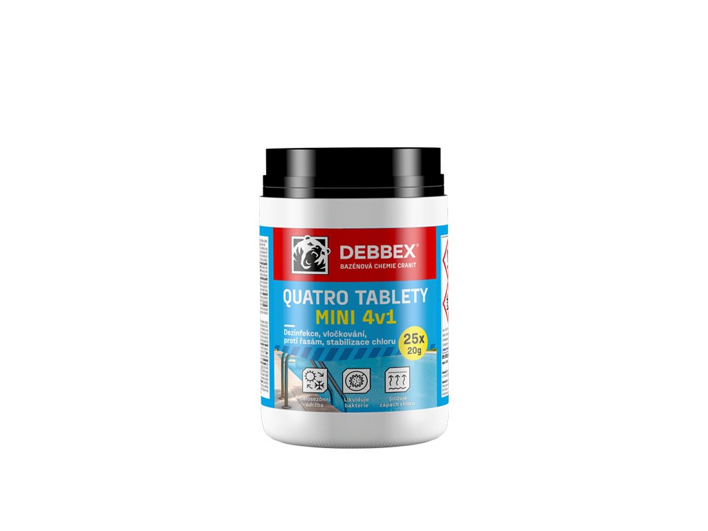 Cranit Quatro MINI je moderní víceúčelový přípravek ve formě tablet, pro celosezónní průběžnou údržbu vody ve všech typech bazénů. Likviduje bakterie a řasy, zabraňuje jejich růstu, umožňuje vyvločkování nečistot a stabilizuje aktivní chlor.