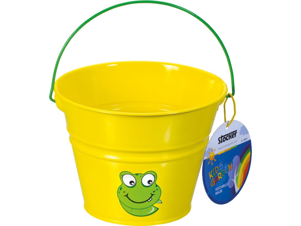 Dětský kovový kyblík ve žluté barvě s obrázkem s dětským motivem.