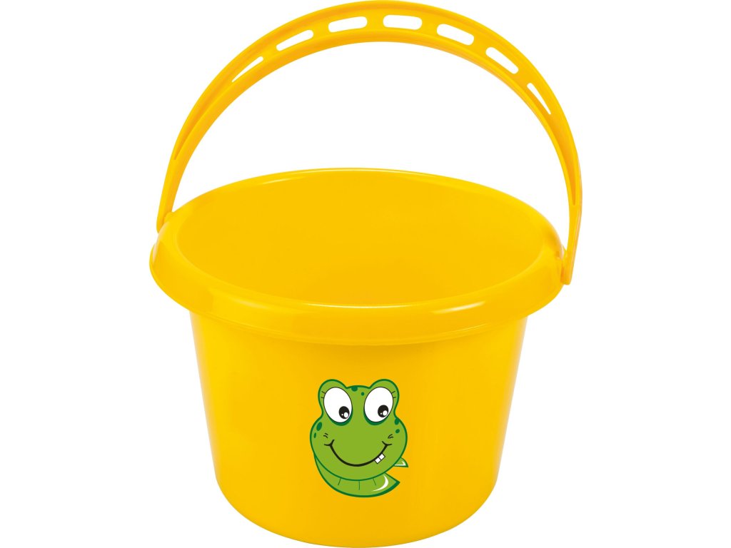 Dětský plastový kyblík ve žluté barvě s obrázkem s dětským motivem.