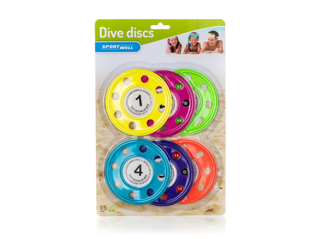 Disk vodní potápěcí, PH mix barev (6 ks). materiál: plast mix barev: žlutá, oranžová, růžová, modrá, tmavě modrá, zelená balení: 6 ks Ppotápěcí disky SPORTWELL jsou skvělou pomůckou pro výuku plavání i zábavu ve vodě. Balení obasahuje kroužky šesti barev. Doporučený věk od 3 let.Doplňkové parametry