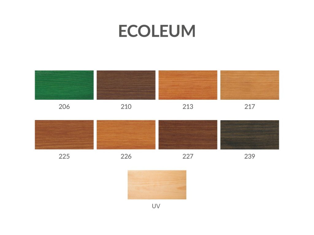 Zahradní architektura, (zahradní domky, ploty, pergoly, altány, můstky atd.) Ideální pro ošetřování zahradní architektury (zahradní domky, ploty, pergoly, altány, můstky apod.) a dřevěných fasádních prvků. Velmi dobře se roztírá a příjemně voní po lněném oleji. Živé barevné odstíny vytváří odolnou vrstvu vůči působení UV záření. Nátěr dodá dřevu přírodní a hedvábný vzhled. Nádherně vykreslí strukturu dřeva! Díky 90-ti procentnímu obsahu lněného oleje penetruje do hloubky. Dále obsahuje pouze 10 % organických rozpouštědel s přídavkem vosku a diaminu (běžné lazury obsahují 50 – 70 % rozpouštědel). V konečném důsledku jedna vrstva ECOLEUM odpovídá 3 – 4 vrstvám běžné lazury. Při opětovné aplikaci po letech nemusíte brousit starý nátěr.