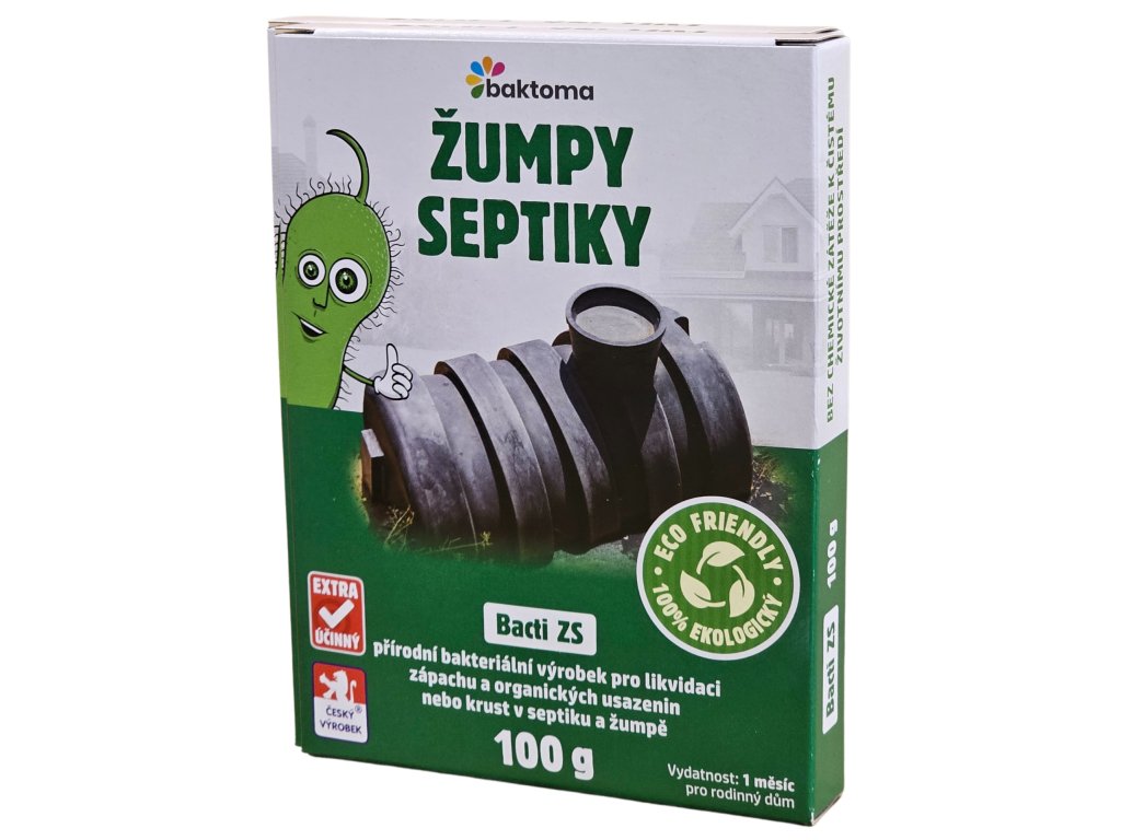 Bacti ZS je prostředek pro žumpy a septiky. Působením této směsi bakterií a enzymů dochází ke zkapalnění pevného organického odpadu, které se změní v nezapáchající kapalinu. Kapalinu lze pak odčerpat a použít pro zálivku trávy mimo záhony a dešťovou kanalizaci. Pokud má septik přepad, kapalina odteče.