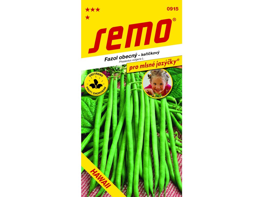 odrůda: Hawaii (kód 0915) - kolekce PRO MLSNÉ JAZÝČKY - lusková odrůda fazole HAWAII má mimořádně tenké a jemné lusky středně zelené barvy s delikátní chutí. Lusky jsou velmi vyrovnané a rovné o délce 12-13 cm. Rostliny jsou silné, s vysokým výnosovým potenciálem. Odrůda je rezistentní k bakteriální spále fazolu (Pseudomonas syringae pv phaseolicola (race 6)), virové mozaice fazolu (BCMV- Bean Common Mosaic Virus) a také k antraknóze fazolu (Colletotrichum lindemuthianum L. rasa lambda).