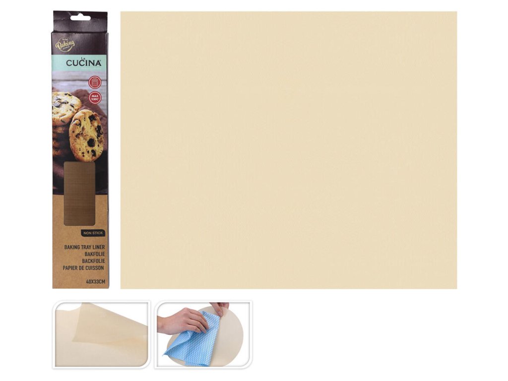 Pečící fólie 40 x 33 cm / 0,07 mm, do 230°C, nepřilnavý povrch. rozměry: 40 x 33 cm tloušťka: 0,07 mm materiál: nepřilnavý povrch 50 x opakované použití Vynikající jako univerzální oboustranná pečicí podložka do všech obvyklých pekáčů a forem na pečení. Připravované pokrmy se nepřipalují, nelepí. Určeno pro mnohonásobné použití (50 x), odolné do 230°C.Doplňkové parametry
