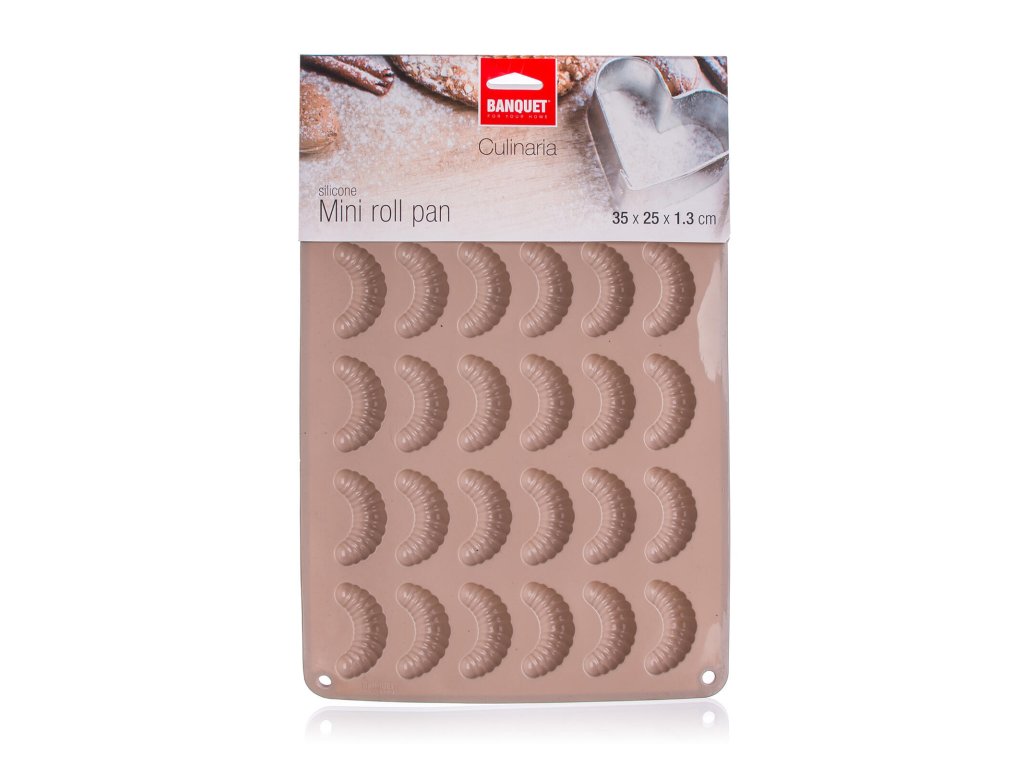 Forma na rohlíčky 30 ks, 35 x 25 x 1,3 cm, silikon HN. rozměry: 35 x 25 x 1,3 cm materiál: silikon barva: hněá Silikonová forma CULINARIA na 30 ks rohlíčků. Forma je odolná proti vysokým teplotám (do 230 st. C) a neváže chutě ani pachy pokrmů. Rohlíčky se k formě nelepí a lze je lehce vyklopit. Forma se snadno udržuje a je skladná a vhodná do myčky na nádobí.Doplňkové parametry