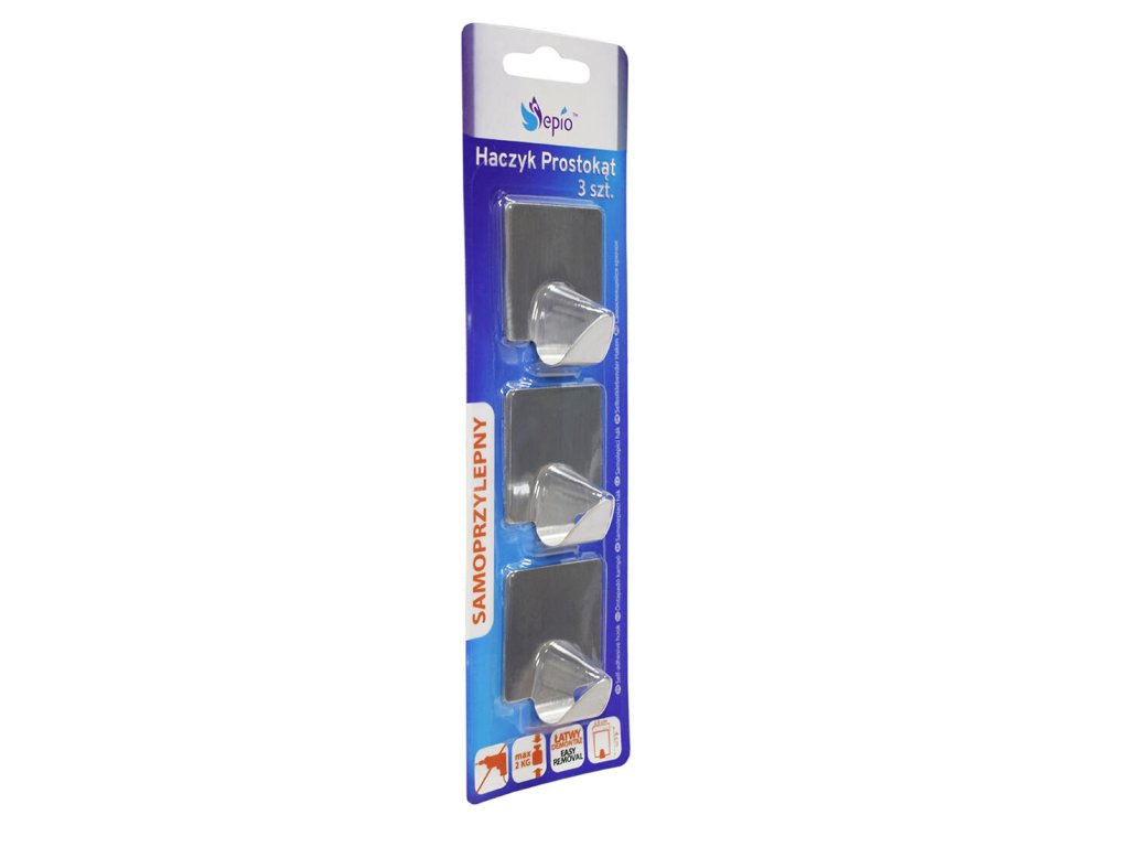 Háček hranatý, samolepicí, nerez (3 ks). rozměry: 2 x 3,5 x 4 cm rozměry balení: 2,1 x 6 x 20 cm materiál: nerez balení: 3 ks Háčky z nerezové oceli, samolepicí. Upevňují se oboustrannou páskou, takže se snadno instalují a nepoškozují dlaždice. Vydrží zatížení až 2 kg.Doplňkové parametry