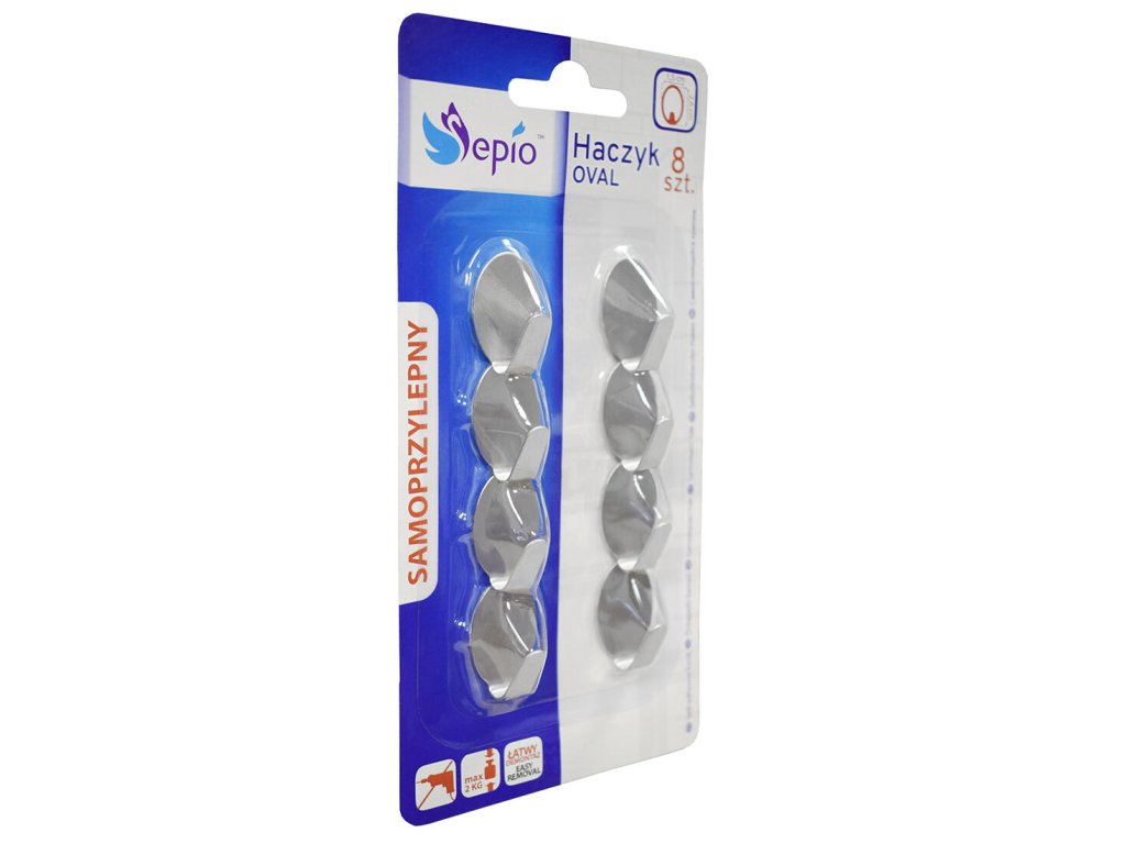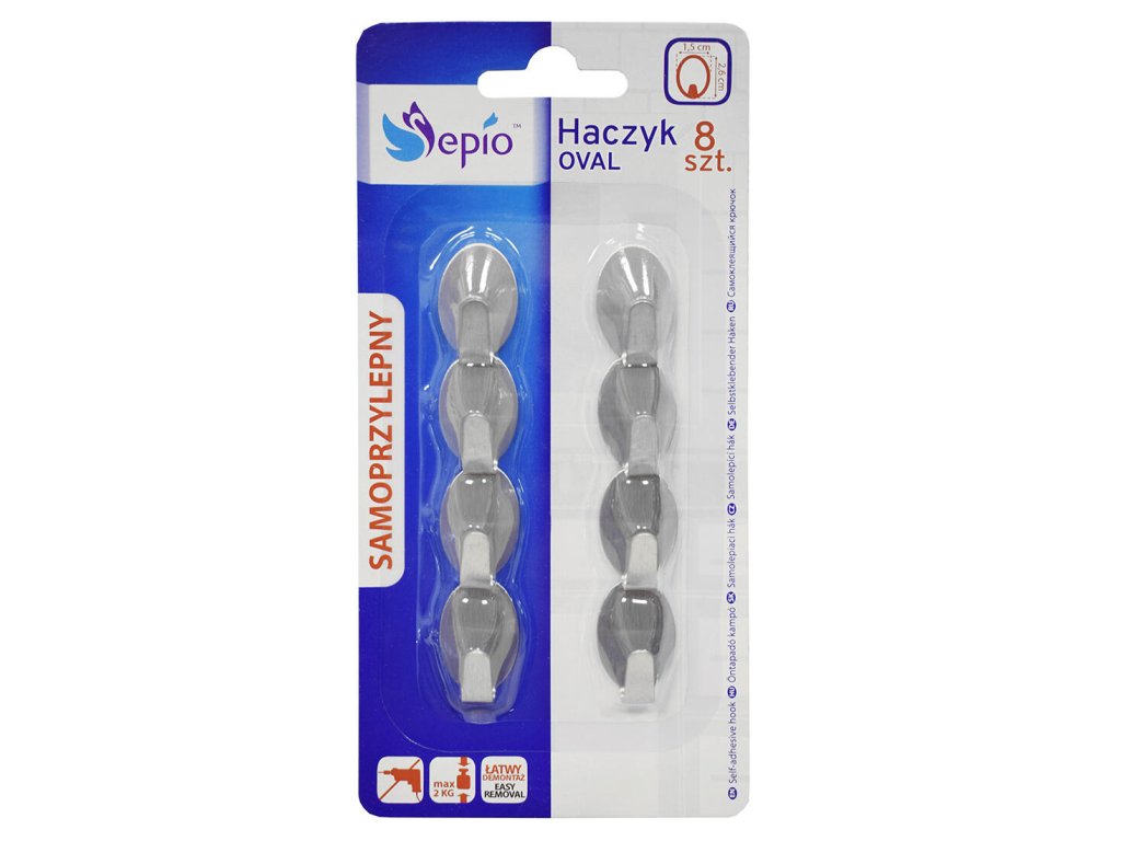 Háček oválný, malý, samolepící, nerez (8 ks). rozměry: 1,2 x 1,5 x 2,6 cm rozměry balení: 1,3 x 8 x 16,5 cm materiál: nerez balení: 8 ks Samolepicí háčky z nerezové oceli. Upevňují se oboustrannou páskou, takže se snadno instalují a nepoškozují dlaždice. Vydrží zatížení až 2 kg.Doplňkové parametry
