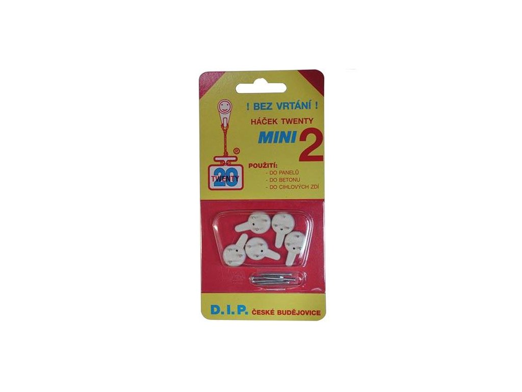 Háček tw. mini II PH BÍ (5 ks) 1104 (7015). materiál: plast barva: bílá balení: 5 ks Háčky TWENTY jsou vyrobeny z vysoce kvalitní plastické hmoty polyamid (nylon), která vyniká maximální pevností a odolností. Rovněž použité hroty, ze speciální kalené oceli, jsou povrchově antikorozně upraveny a umožňují aplikaci háčku i v krajně nepříznivých podmínkách. Háčky jsou s úspěchem používány do betonu, panelů, umakartu, tvrdého dřeva a po zajištění delším hřebíkem, i v pórovitých a měkčích materiálech, omítce, pazdeřových deskách atd. Výborně drží též v plechu, nebo ocelových zárubních, i když pro tento účel nejsou přímo určeny.Doplňkové parametry