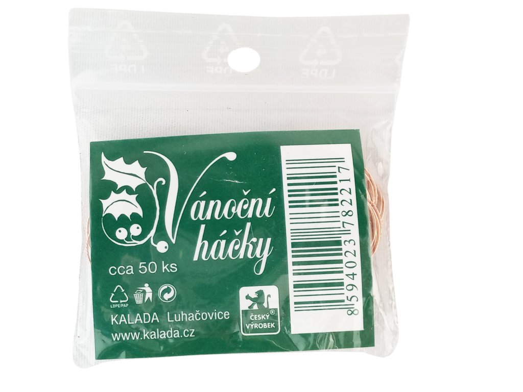 Popis:Vánoční závěsné háčky - poměděné, délka 5 cm. Balení obsahuje 50 ks.