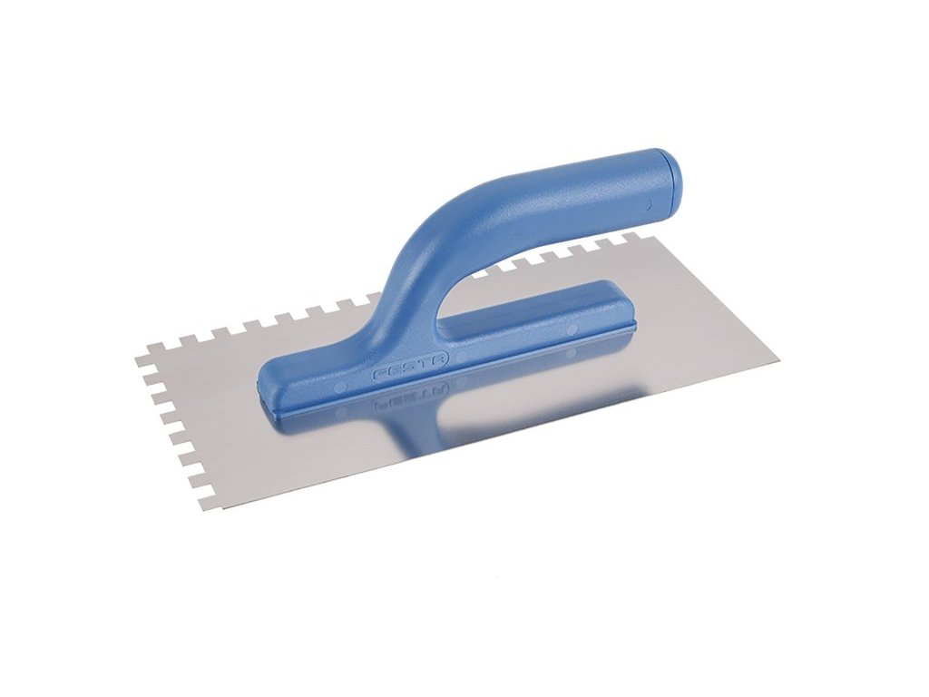 Hladítko nerezové zubové FESTA 280x130 mm, zub e8, s plastovou ručkou, tl.plechu 0,8 mm. Používá se zejména k nanášení lepidel pod obklady a dlažby, dále pak k nanášení stěrek, štuků, omítek, tmelů a dalších stavebních hmot. Hladítko nerezové zubové umožní natáhnout lepidlo či stavební hmotu v pruzích a výšce dle zubu hladítka.Doplňkové parametry
