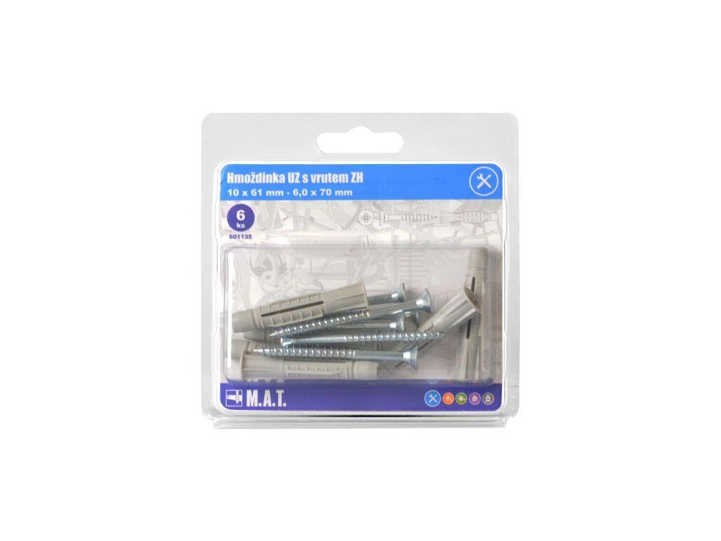hmoždinka uzlovací s lemem 10x61 UH-L vrut un. polozávit 6x70mm ZB Balení obsahuje 6ks Kompletní sada obsahuje hmoždinku a vrut, která zaručuje snadnou a spolehlivou montáž.Doplňkové parametry
