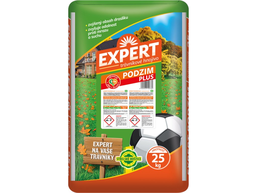Hnojivo EXPERT PODZIM PLUS je granulované hnojivo, vhodné pro podzimní a pozdní podzimní hnojení všech druhů trávníků. Vysokým obsahem draslíku se zabezpečí vysoká odolnost trávníku proti vymrzání a napadení houbovými chorobami, které se šíří hlavně pod sněhovou pokrývkou. Použitím tohoto hnojiva na začátku léta ( červen ), se zvýší odolnost trávníku proti suchu v průběhu letních měsíců. Jemná granulace, potlačování mechu v trávníku.