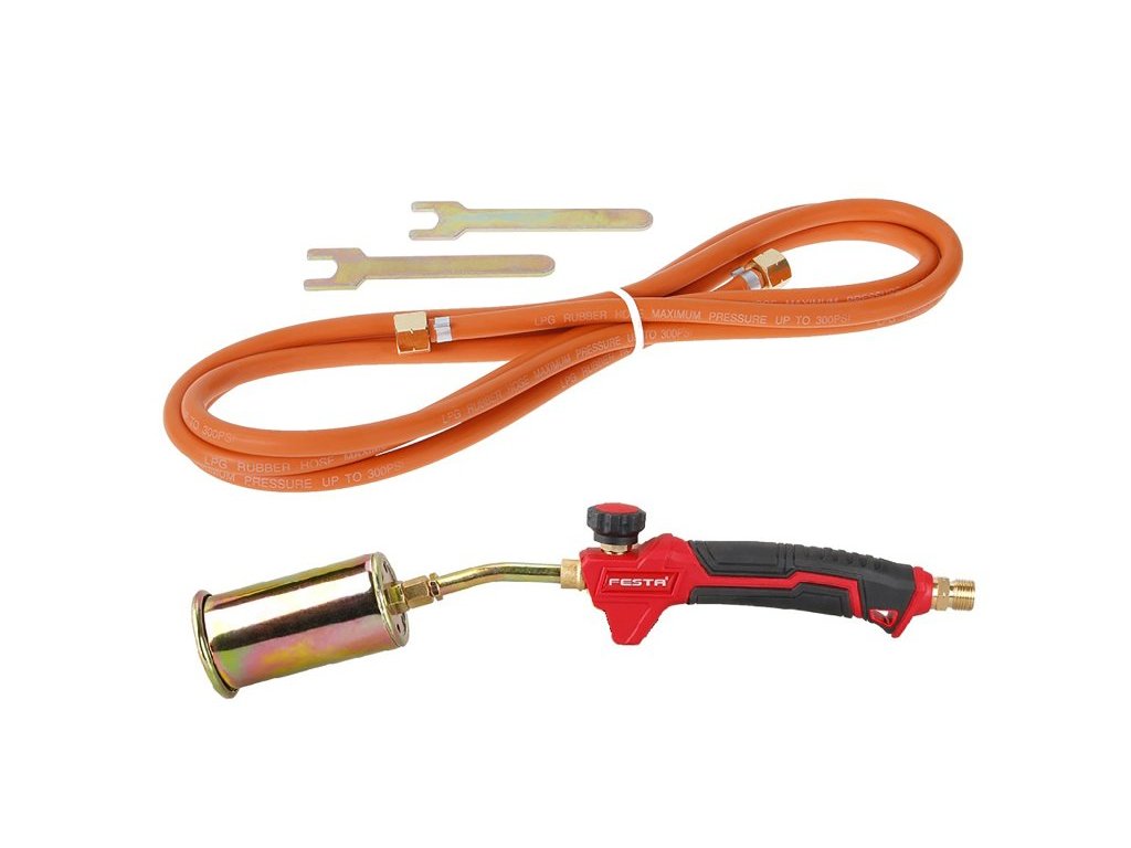 hořák FESTA na propan-butan (LPG) - sada s hadicí 3 m hadice s certifikací maximální výkon 12 kW ergonomická neklouzavá rukojeť, plynulá regulace průtoku průměr koncovky 35mm, délka 350mm vhodné hadice 3 m - 69910 napojení přes ventil/regulátor - 69923, 69920 nebo 69907 Hořáky s regulací o výkonu 35kW na propanbutan, délka 350mm. Hadice 3m.Doplňkové parametry