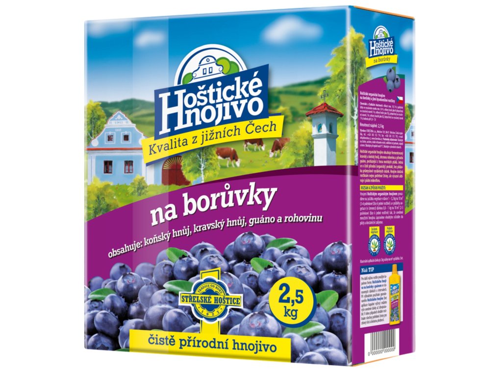 Hoštické organické hnojivo na borůvky obsahuje fermentovaný kravský a koňský hnůj, drcenou a granulovanou rohovinu a přírodní guáno, pocházející z trusu mořských ptáků. Jedná se o čistě přírodní produkt, bez přídavku průmyslově vyráběných složek. Hnojivo dodává nejen potřebné živiny, ale výrazně aktivuje i půdní mikroflóru.