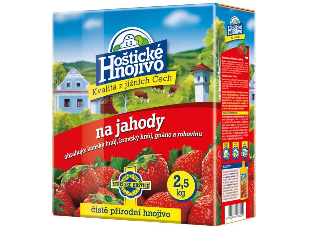 Hoštické organické hnojivo na jahody obsahuje fermentovaný kravský a koňský hnůj, drcenou a granulovanou rohovinu a přírodní guáno, pocházející z trusu mořských ptáků. Jedná se o čistě přírodní produkt, bez přídavku průmyslově vyráběných složek. Hnojivo dodává nejen potřebné živiny, ale výrazně aktivuje i půdní mikroflóru.