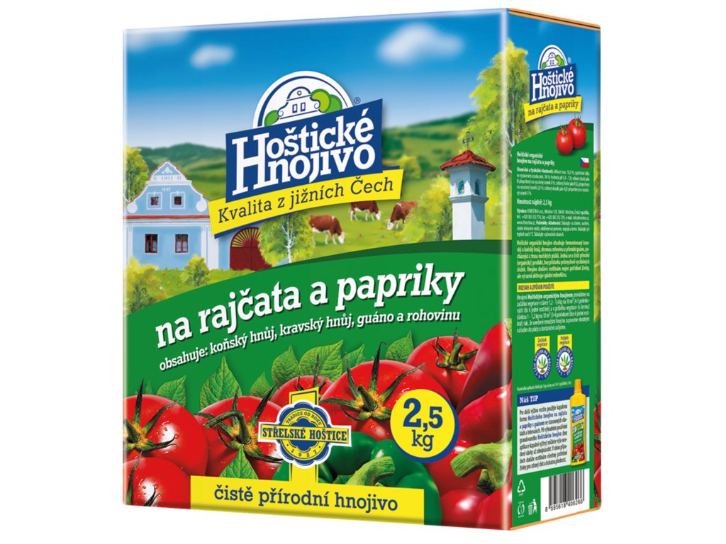 Hoštické organické hnojivo na rajčata a papriky obsahuje fermentovaný kravský a koňský hnůj, drcenou a granulovanou rohovinu a přírodní guáno, pocházející z trusu mořských ptáků. Jedná se o čistě přírodní produkt, bez přídavku průmyslově vyráběných složek. Hnojivo dodává nejen potřebné živiny, ale výrazně aktivuje i půdní mikroflóru.