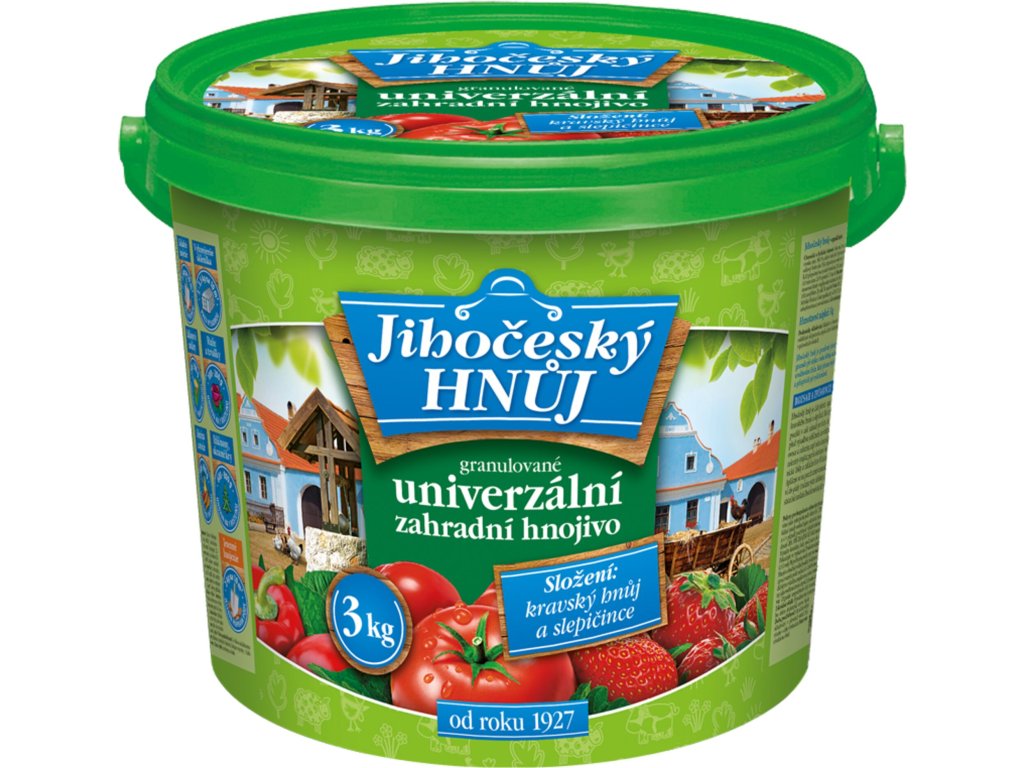Jihočeský hnůj je čistě přírodní organické hnojivo (směs kravského hnoje a slepičinců). Hodí se nejen pro univerzální použití v celé zahradě pro květiny a okrasné rostliny (např. před výsadbou jehličnanů), ale obzvláště pro zdravou výživu ovoce a zeleniny, např. celeru, kapusty, zelí, květáku a plodové zeleniny (rajčat, paprik, okurek apod.). Hnojivo obsahuje organické látky a základní živiny NPK, ale i další stopové prvky. Aplikuje se na povrch zeminy rozhozem a pak se mírně zapraví do půdy (ručním rytím, zahrabáním apod.) a následně dostatečně zavlaží. Produkt neobsahuje klíčivá semena plevelů.
