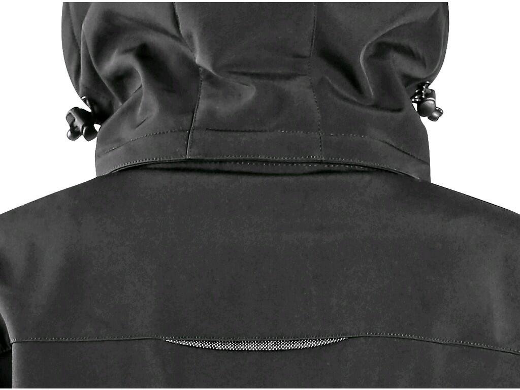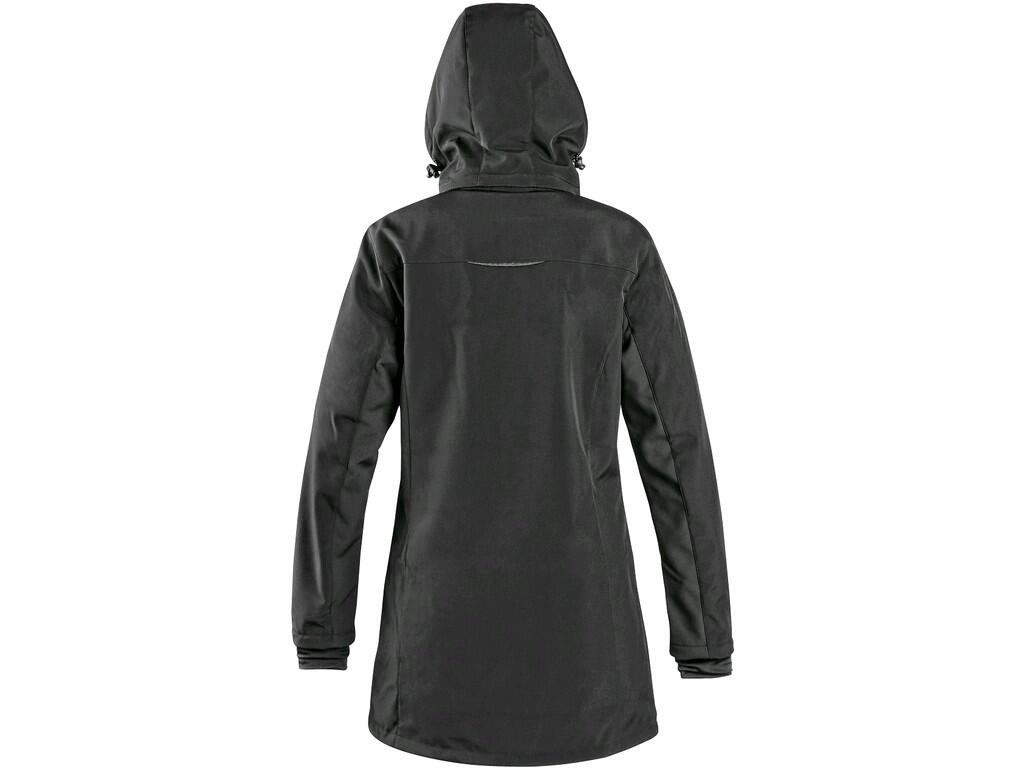Dámský softshellový kabát s odepínací kapucí, odolný proti vodě a větru, zapínaní na zip, rukávy s vnitřními manžetami, stahování v dolním okraji, spodní kapsy na zip, relfexní doplňky, TPU membrána, odolnost materiálu proti průniku vody 10 000 mm mimo oblast švů, paropropustnost 3 000 g/m2/24h.Doplňkové parametry
