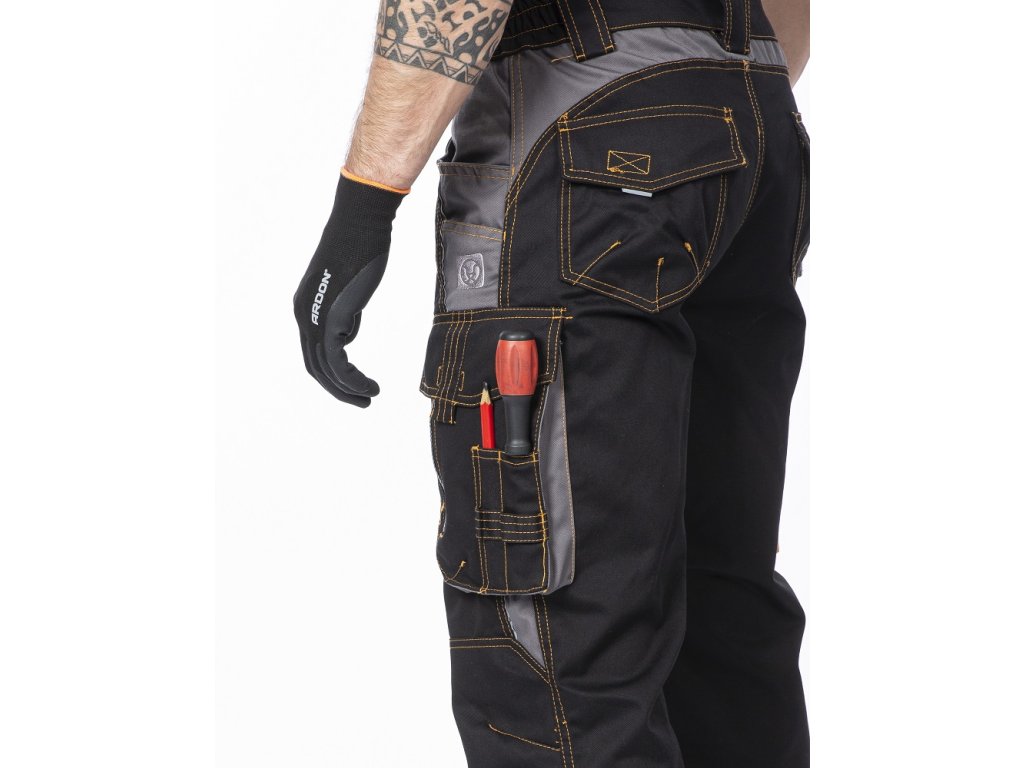 - kapsy na šroubovák, poutka na tužky, 2 kapsy na skládací metr integrované do lampasu na levé i pravé straně