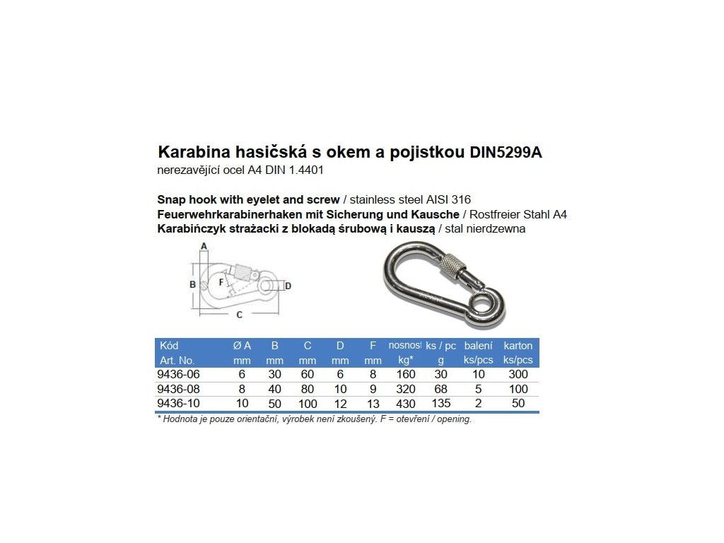 Karabina hasičská s okem a pojistkou DIN 5299A nerez A4