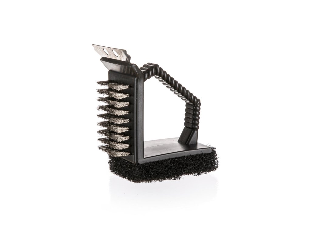 Kartáč na čištění grilu 3 v 1, PH. materiál: plast Plastový čisticí kartáč 3 v 1 je určený na údržbu a čistění grilu a grilovací mřížky. Kartáč je praktický pomocník při úklidu grilu po grilování. Obsahuje škrabku pro odstranění hrubých nečistot z grilovací desky, kovový kartáč na očištění hrubých nečistot z grilovací mřížky a houbovitou stěrku na dočištění urdžovaných ploch.Doplňkové parametry