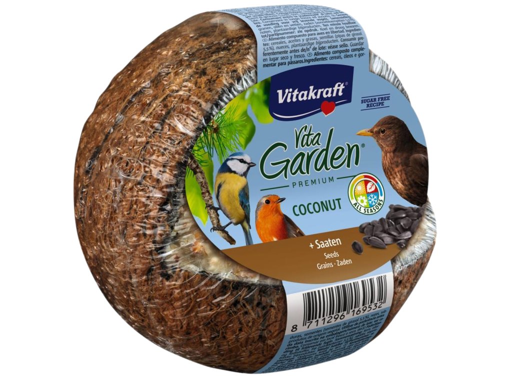 Doplňkové krmivo pro zahradní ptactvo. Kokosy VITA GARDEN® jsou bohaté na tuky, obiloviny a chutná semena. Cenný doplněk stravy volně žijících zahradních ptáků po celý rok. Receptura bez cukru. Neobsahuje umělá barviva ani konzervační látky.