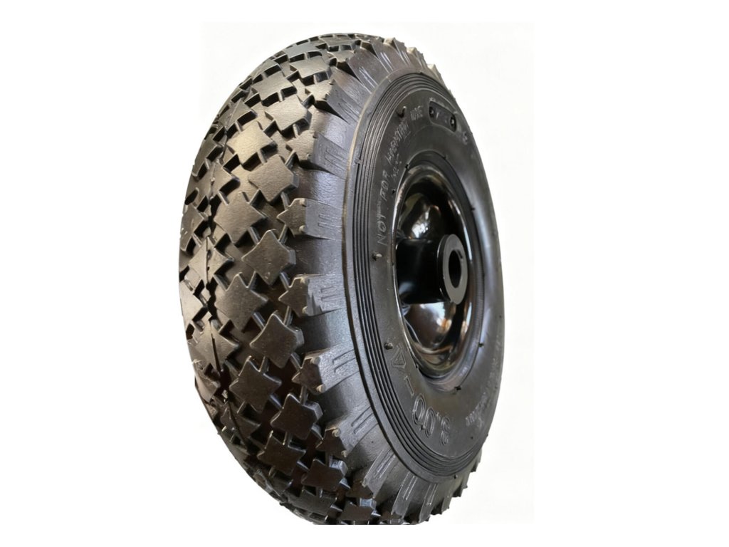Kolo k rudlíku 260/20 mm, JL, nafukovací, kov. disk. velikost: 3.00-4 průměr: 260 mm průměr náboje: 20 mm materiál: kov.disk jehličkové ložisko Kovové kolo 260/20 mm k rudlíku s nafukovací pneumatikou.Doplňkové parametry