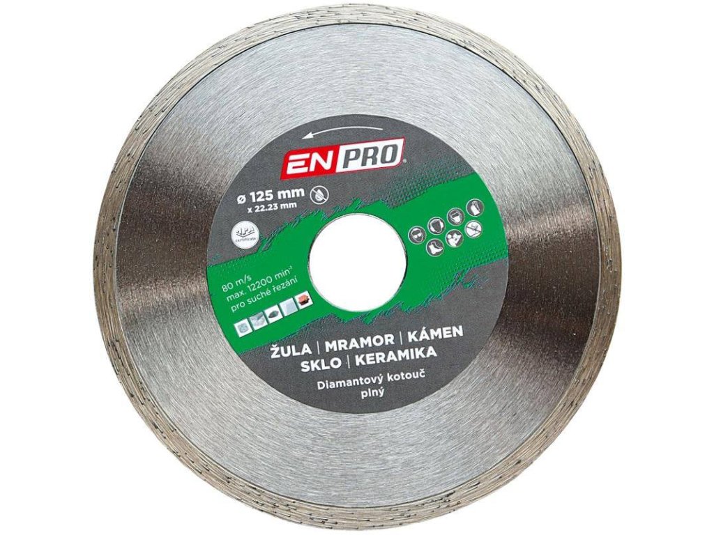- Diamantové kotouče prémiové značky ENPRO, která je zárukou profesionální kvality. ENPRO kotouče vynikají především vysokou kvalitou použitého materiálu a dlouhodobou životností. Certifikace MPA. Celoobvodové kotouče se využívají na tvrdé materiály, které se snadno štěpí jako: beton, žula, sklo a keramika. Charakteristickým rysem je hladký řez bez odštěpků. Kotouč je uzpůsoben na řezání za mokra, ale zvládne i suchý řez.