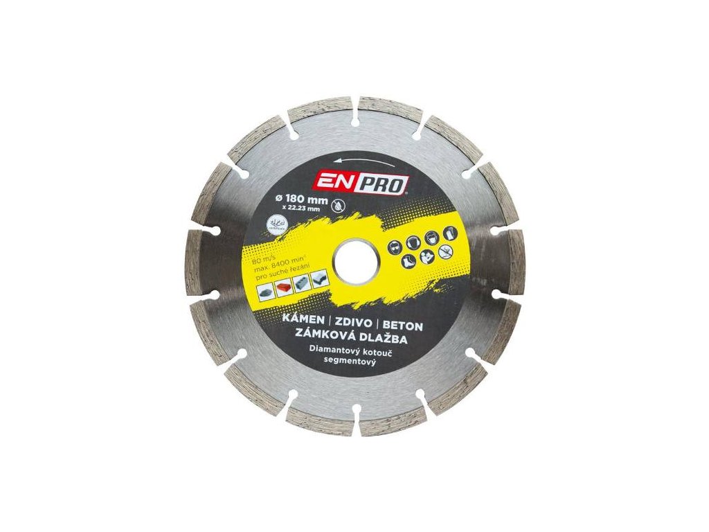 - Diamantové kotouče prémiové značky ENPRO, která je zárukou profesionální kvality. ENPRO kotouče vynikají především vysokou kvalitou použitého materiálu a dlouhodobou životností. Certifikace MPA. Segmentové kotouče jsou vhodné na pevnější materiály jako jsou: kámen, zdivo, beton, zámková dlažba, žula, mramor. Lze provádět suché i mokré řezy.