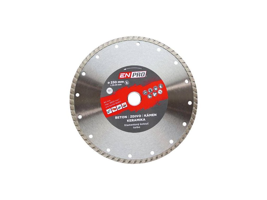 - Diamantové kotouče prémiové značky ENPRO, která je zárukou profesionální kvality. ENPRO kotouče vynikají především vysokou kvalitou použitého materiálu a dlouhodobou životností. Certifikace MPA. Turbo kotouče se využívají na řezání různých druhů materiálů jako jsou: beton, zdivo, kámen, keramiku, žulu, mramor. Turbo kotouče jsou ideálním výběrem pro kombinaci mezi segmentovým a celoobvodovým kotoučem. Poskytují hladký řez a lze je využít na řezání za mokra i sucha.