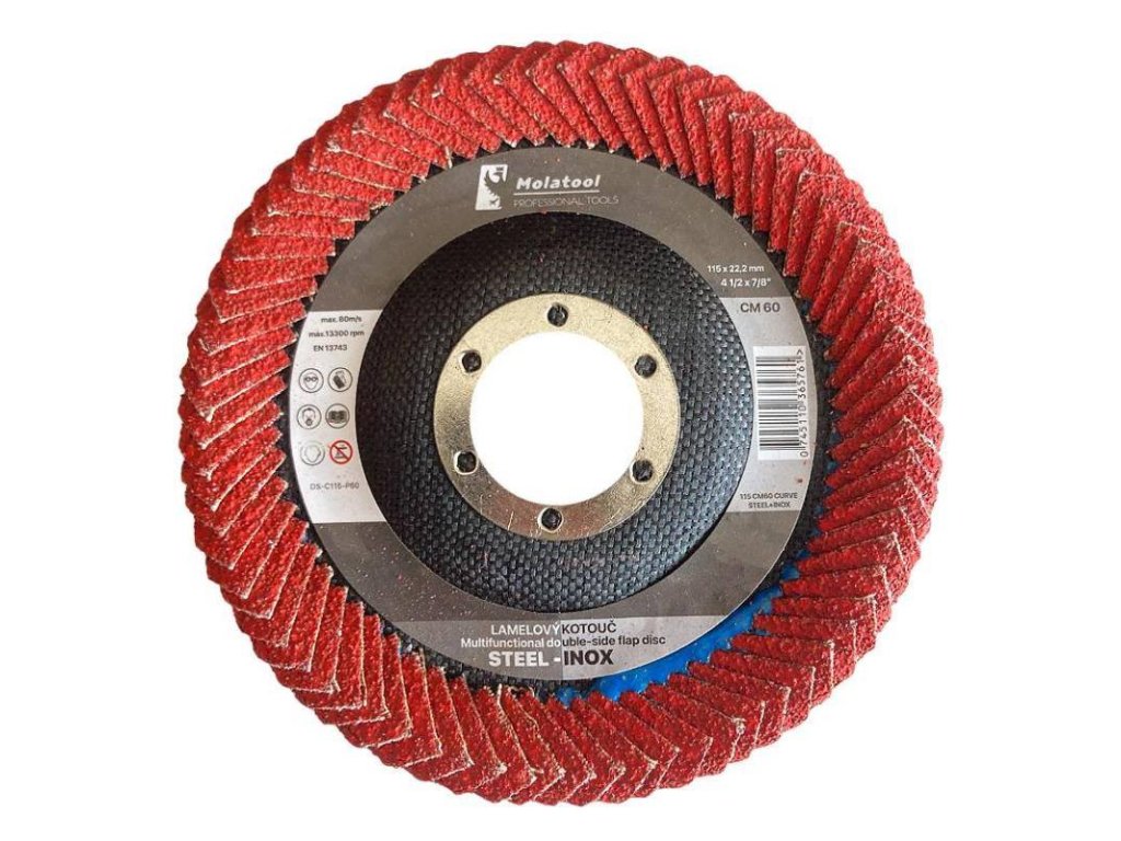 - brusný kotouč se špičkovým samoostřícím keramickým brusivem, kde lamely jsou na všech pracovních plochách (spodní, čelní a horní) kotouče a tvarově jsou přizpůsobeny pro broušení standardně i obtížně dostupných svarových ploch jakýchkoliv svarků jakož i všech typů obrobitelných materiálů, běžné oceli a ocele vyšších pevností, legovaná ocel, nerezovaných ocelí, tvrdých materiálů, svařovacích materiálů atd.