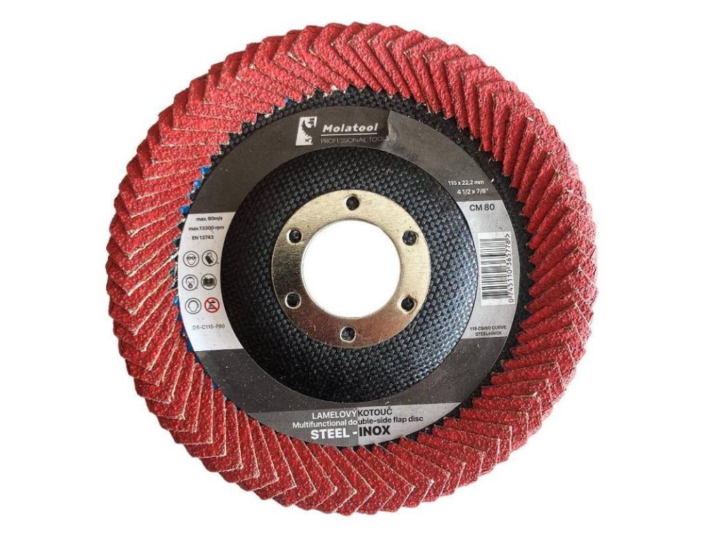 - brusný kotouč se špičkovým samoostřícím keramickým brusivem, kde lamely jsou na všech pracovních plochách (spodní, čelní a horní) kotouče a tvarově jsou přizpůsobeny pro broušení standardně i obtížně dostupných svarových ploch jakýchkoliv svarků jakož i všech typů obrobitelných materiálů, běžné oceli a ocele vyšších pevností, legovaná ocel, nerezovaných ocelí, tvrdých materiálů, svařovacích materiálů atd.