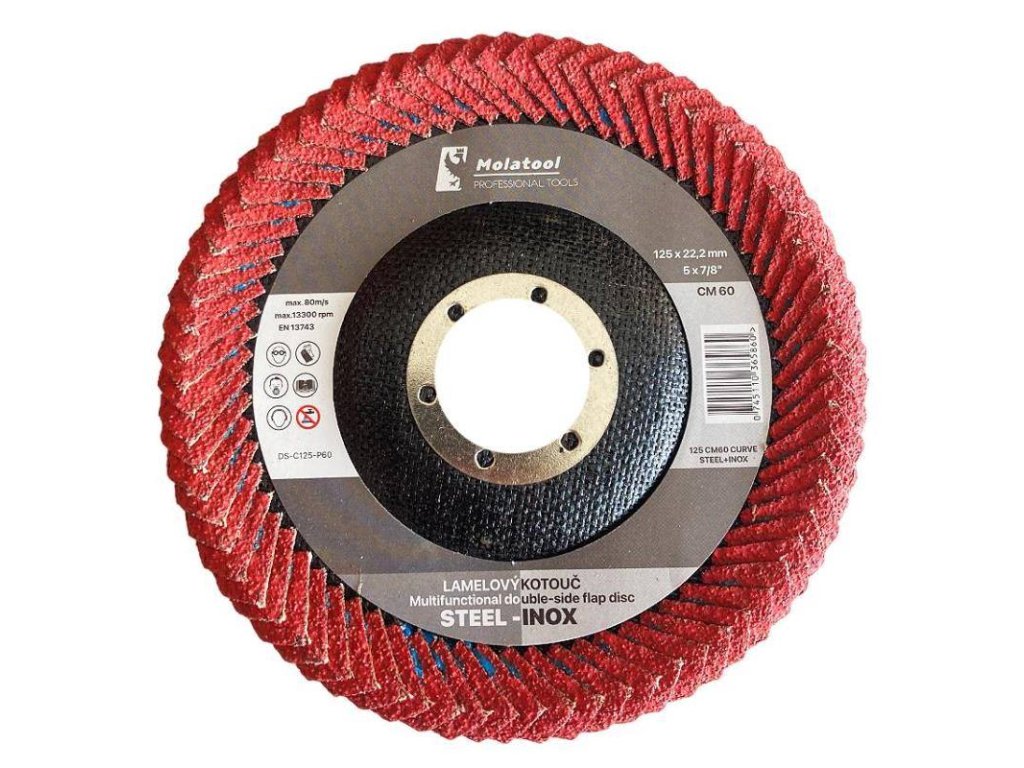 - brusný kotouč se špičkovým samoostřícím keramickým brusivem, kde lamely jsou na všech pracovních plochách (spodní, čelní a horní) kotouče a tvarově jsou přizpůsobeny pro broušení standardně i obtížně dostupných svarových ploch jakýchkoliv svarků jakož i všech typů obrobitelných materiálů, běžné oceli a ocele vyšších pevností, legovaná ocel, nerezovaných ocelí, tvrdých materiálů, svařovacích materiálů atd.