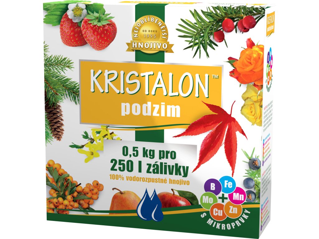 Kristalon podzim je univerzálním hnojivem rozpustným ve vodě, které je s oblibou využíváno pro usnadnění přípravy rostlin na období vegetačního klidu. Přípravek je určen k hnojení ovocných a okrasných dřevin, jahod a růží. Díky nízkému obsahu dusíku je podporováno ukončení růstu rostlin, obsah draslíku zase zajistí vyzrávání rostlinných pletiv před příchodem zimy. Rostliny jsou odolnější vůči mrazu.