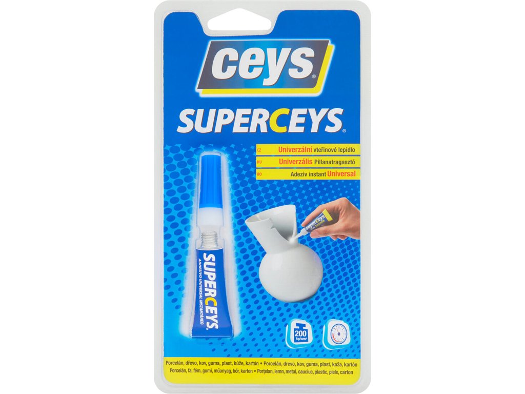 vhodné materiály: porcelán, plasty, kovy, guma, mramor, dřevo, sklo, kůže, karton, papír odolnost zátěži: 180 kg/cm2 teplotní odolnost: -10 - +65 °C pro lepení obtížných spojů Vteřinové lepidlo SUPERCEYS 3g je sekundové kyanoakrylátové lepidlo vysoké pevnosti a velice jednoduchého použití, je ideální pro rychlé drobné opravy a po zaschnutí je transparentní.Doplňkové parametry